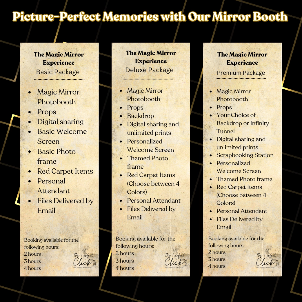 We offer the latest in photobooth technology with our interactive mirror booth services. Our 65-inch touch screen mirror boasts a DSLR camera for high-quality photos that will capture your special moments in style. Elevate your event with our sleek and modern mirror booth, perfect for weddings, parties, and corporate events. Let ThePerfectClick360 add a touch of fun and sophistication to your next gathering. Book now for an unforgettable experience!"