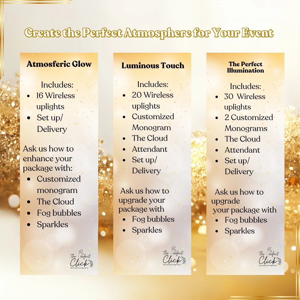 Add elegance and excitement to your event with our expertly curated packages. Featuring vibrant uplights to set the perfect mood, personalized monograms to make your event uniquely yours, and stunning effects like dreamy clouds, dazzling sparkles, and whimsical fog bubbles, we create an atmosphere that captivates your guests. Whether you're planning a wedding, birthday, or corporate event, The Perfect Atmosphere ensures every detail enhances your celebration, leaving unforgettable memories for you and your guests.