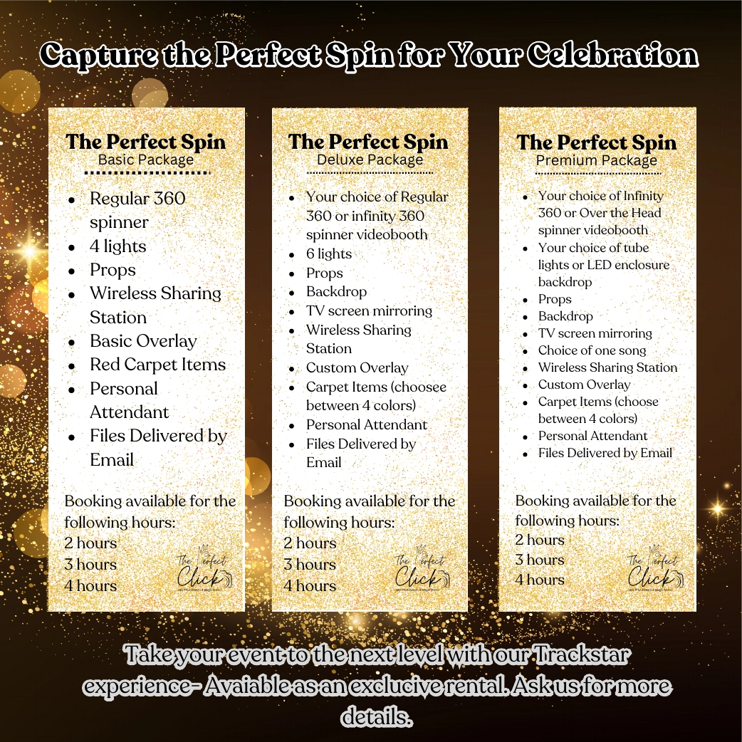 360 Moments, Perfectly Captured" Transform your event into an unforgettable experience with The Perfect Click's cutting-edge 360 booths. Whether it's the classic 360, Over the Head, Infinity, or TrackStar setup, we bring the perfect blend of technology and creativity to every celebration. Add stunning effects like LED lights and dynamic backdrops to enhance the magic, while instant sharing ensures your guests relive the moment again and again.